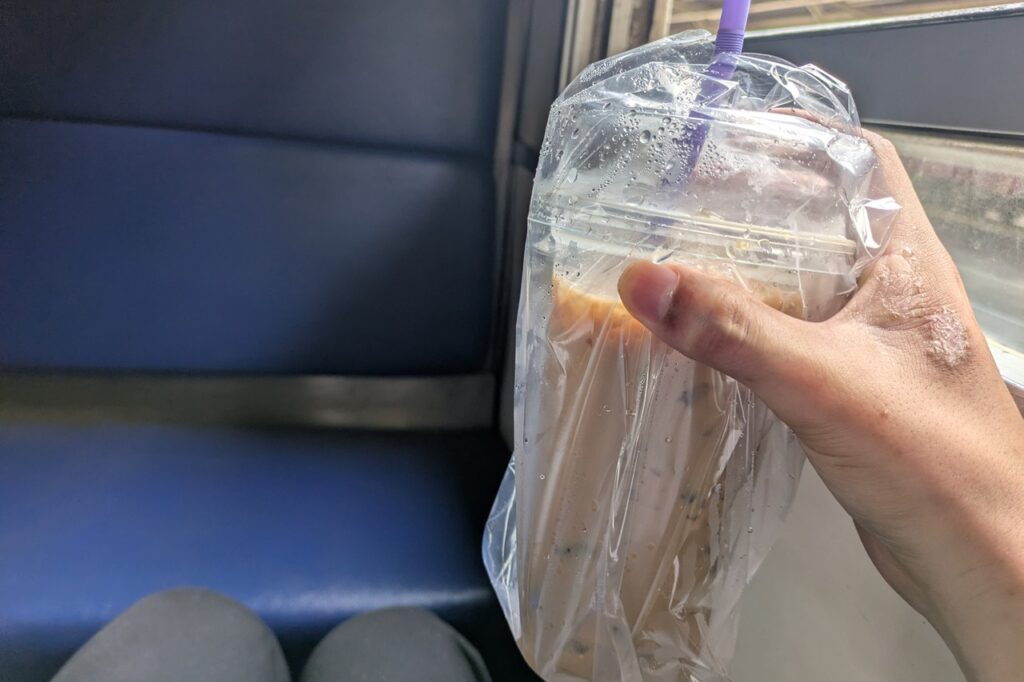 車内には弁当やお菓子などを売りに回る人が何人かいます。私はコーヒーを買いました。20バーツ。